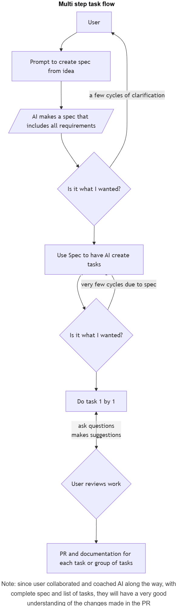 The multi step flow at first seems longer… but results in fewer iterations for changes due to confusion (by the AI) and results in way more documentation such as a full spec and dev plan. There is more maintainability overall with clarity of the changes.