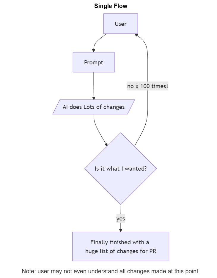 This system adds much more flexibility for user questions and suggestions all throughout the process, allowing the dev to act as a coach to a very smart junior dev as they tackle a large scale change. This is contrasted by the fire-and-forget nature of the single prompt flow that ends in messy conversation and lack of clarity.